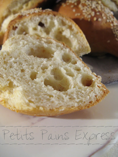 Alors je me suis mise en quête d'une recette de petits pains express et suis tombée sur cette pépite chez Marie-Pierre. Des petits pains tout simplement bluffants, ultra rapides à faire puisque cuisson comprise il m'aura fallu à peine 40 min avant de pouvoir les déguster, encore tout chauds puisqu'à peine sortis du four, avec une croûte bien croustillante et terriblement craquante sous la dent et surtout avec un goût authentique de pain frais. Bref, dorénavant, ces petits pains vont très souvent s'inviter à la table de mes petits déjeuner, ça c'est certain (même si j'ai regretté qu'ils ne soient pas aussi jolis que ceux de Marie-Pierre) !